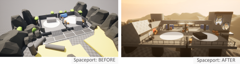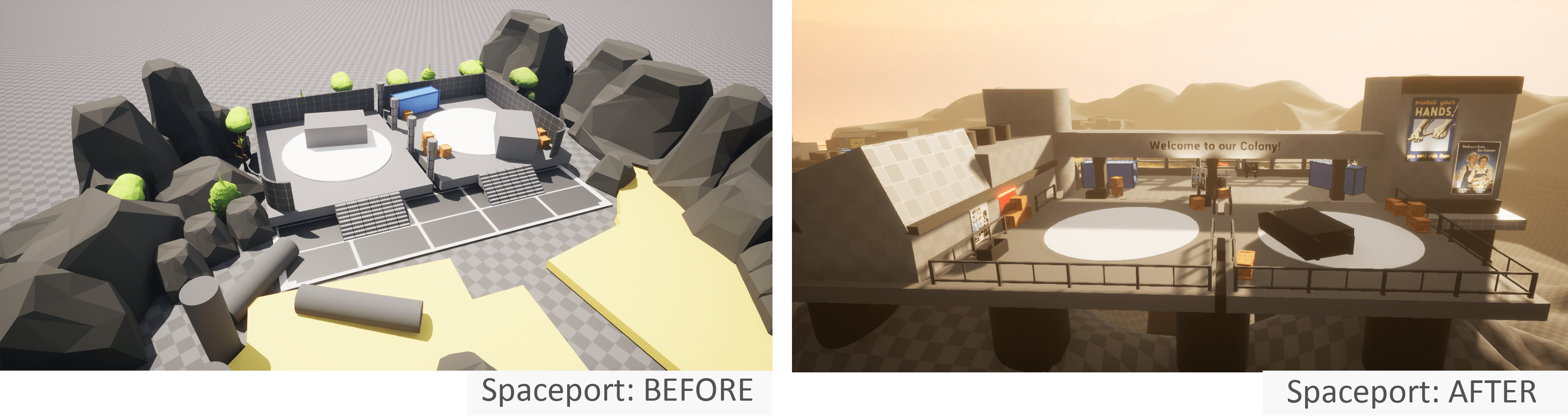 Transform the spaceport and surrounding areas into a visually and narratively compelling introduction. The aim was to improve player immersion, guide narrative flow, and ensure that environmental storytelling supports gameplay progression from the very start.