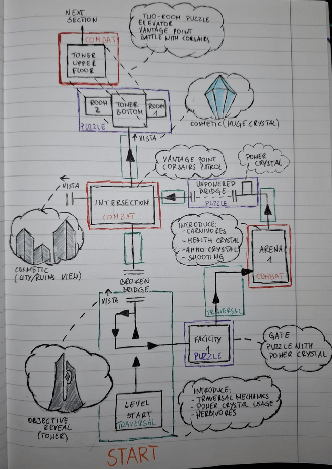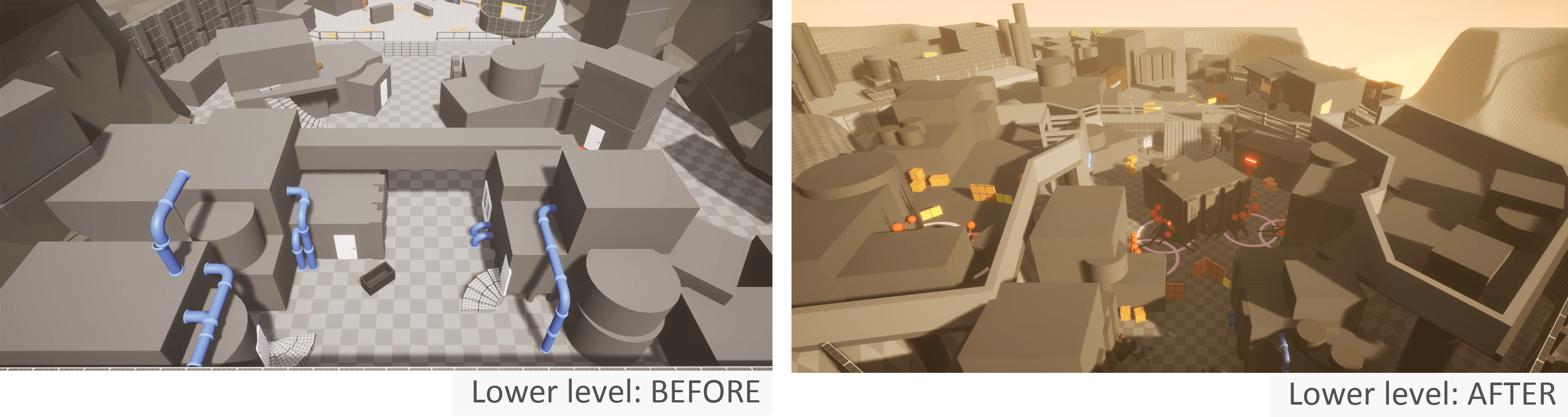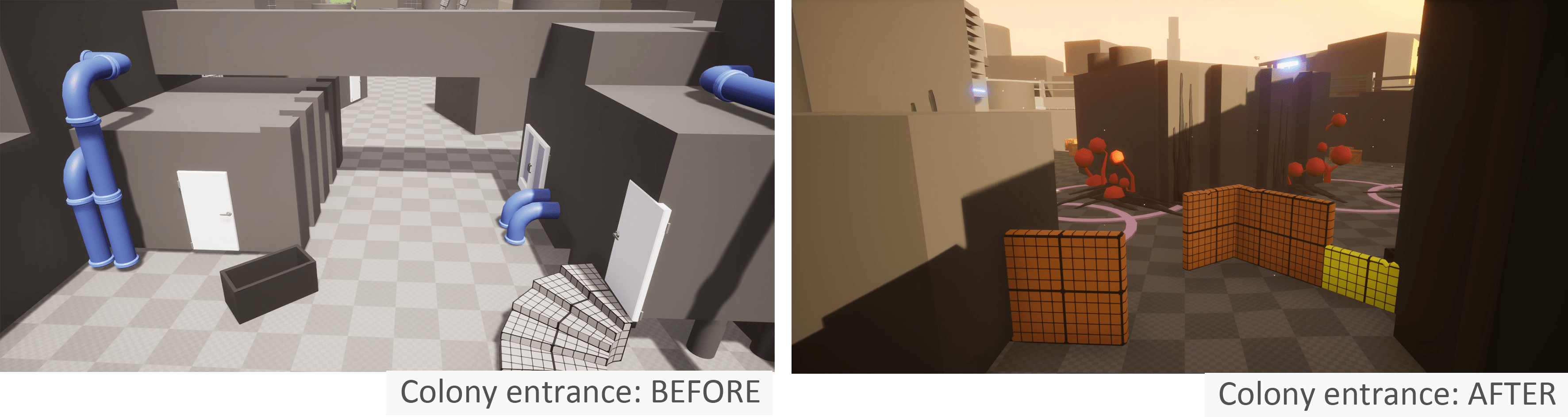 I assessed the level using core level design principles and identified that the lower part of the colony lacked spatial depth, player guidance, and purposeful encounters.