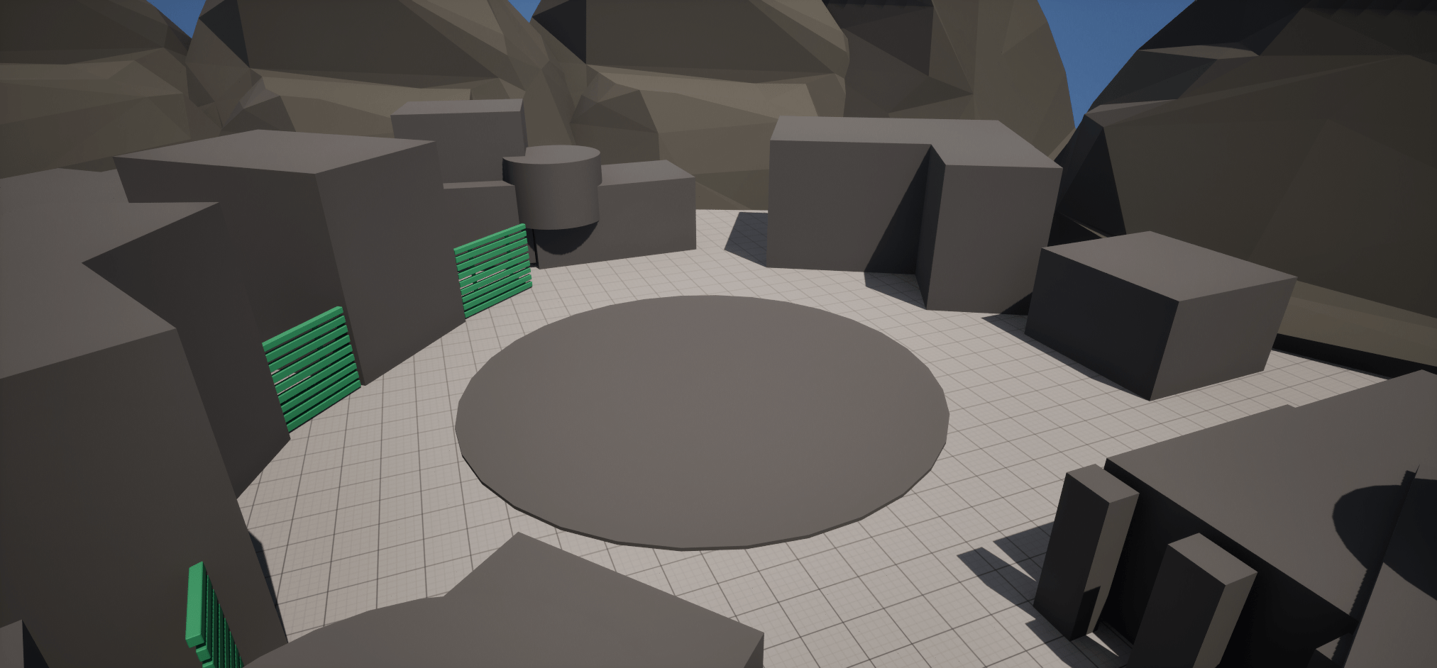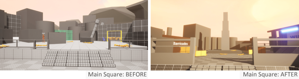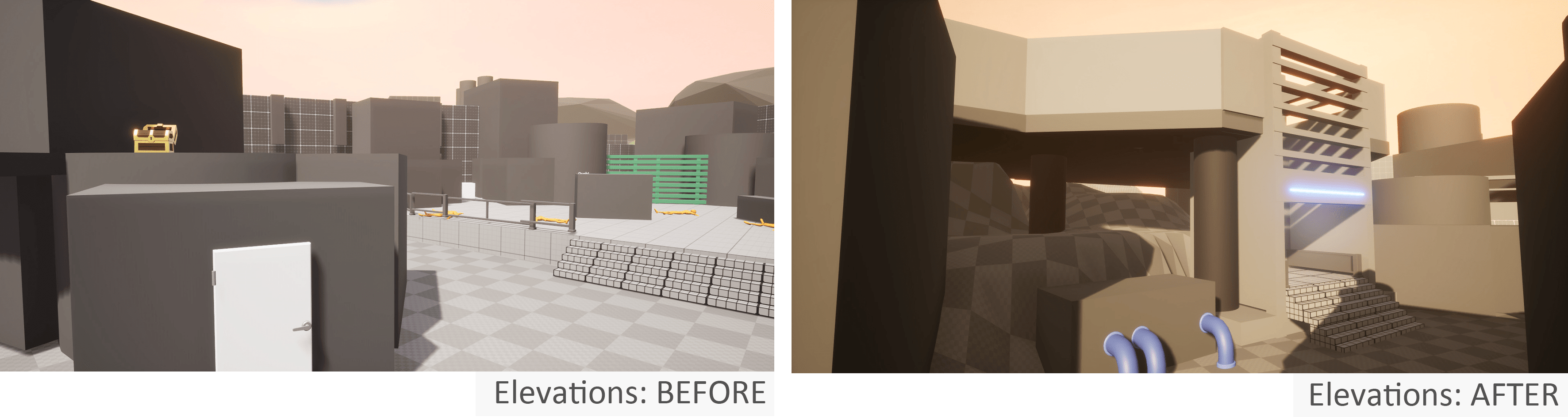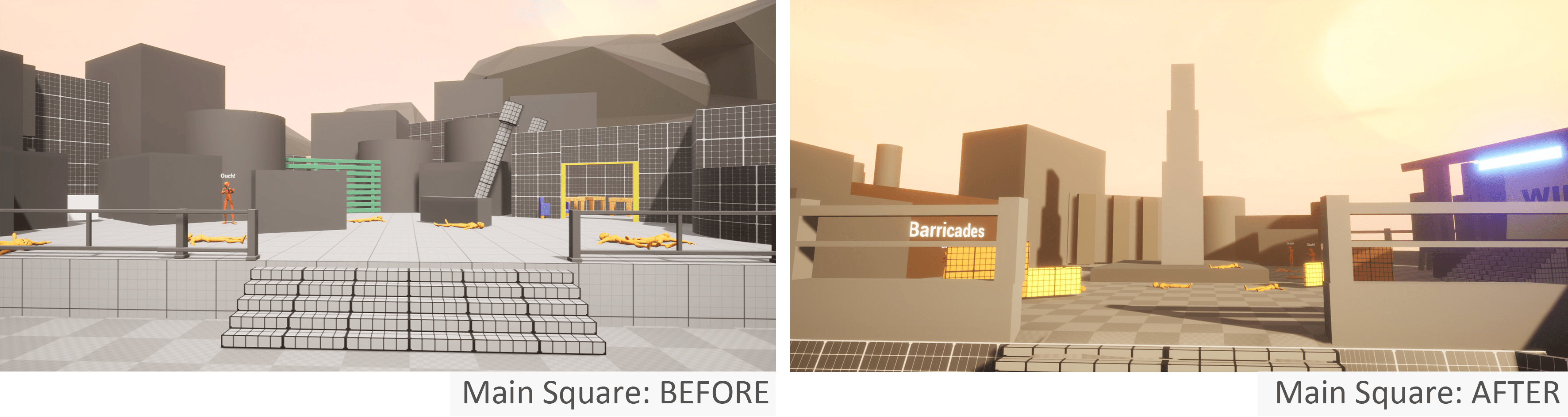 - To fix this, I added elevation by placing key buildings on raised platforms. This not only improved the visual composition but also introduced verticality into exploration and combat.