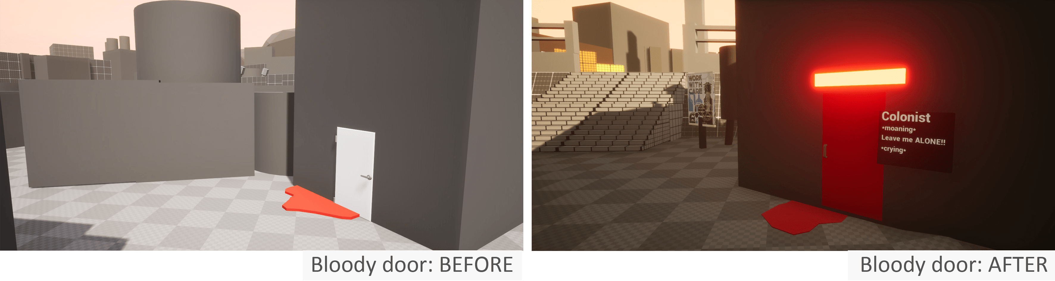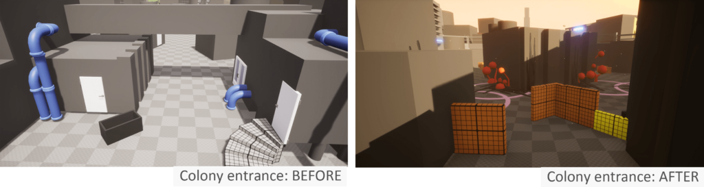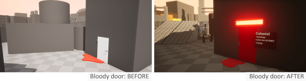 - To improve orientation, I added a tall landmark tower visible from the colony entrance. I also rebuilt a narrative moment at the red-lit bloody door to enhance story delivery.