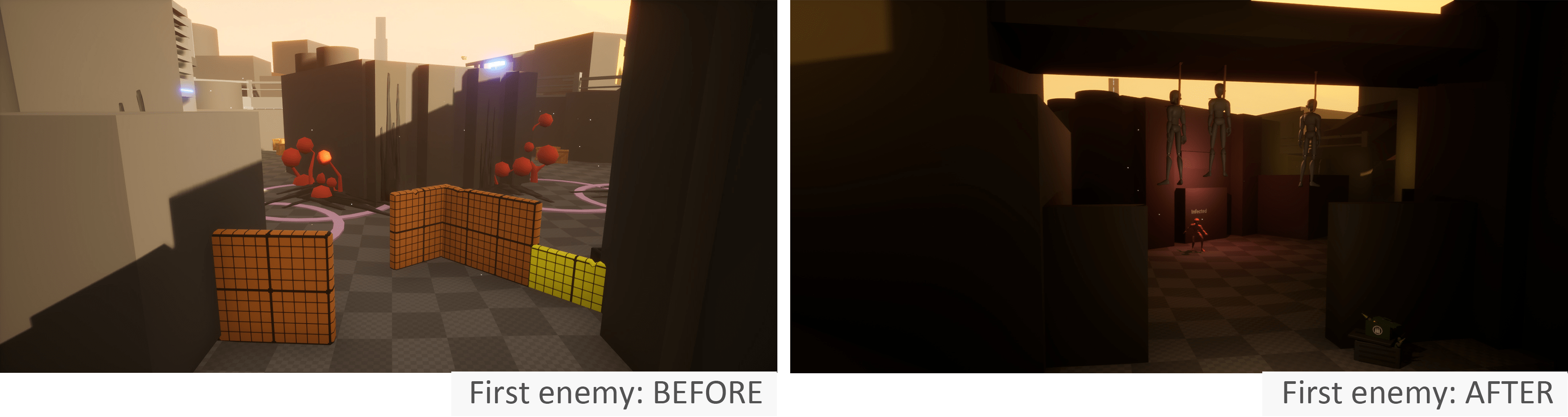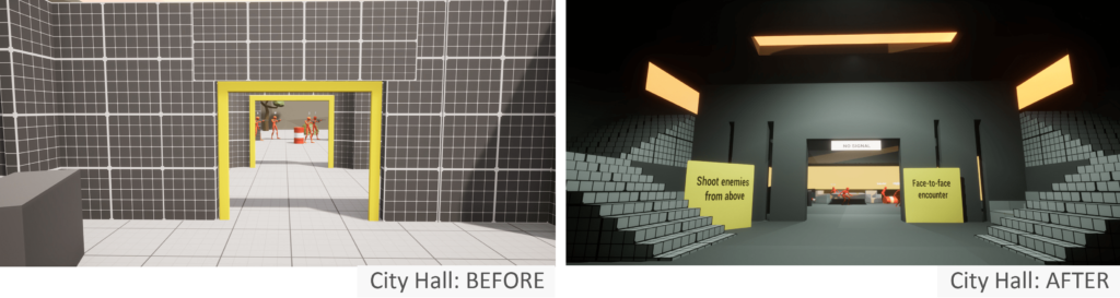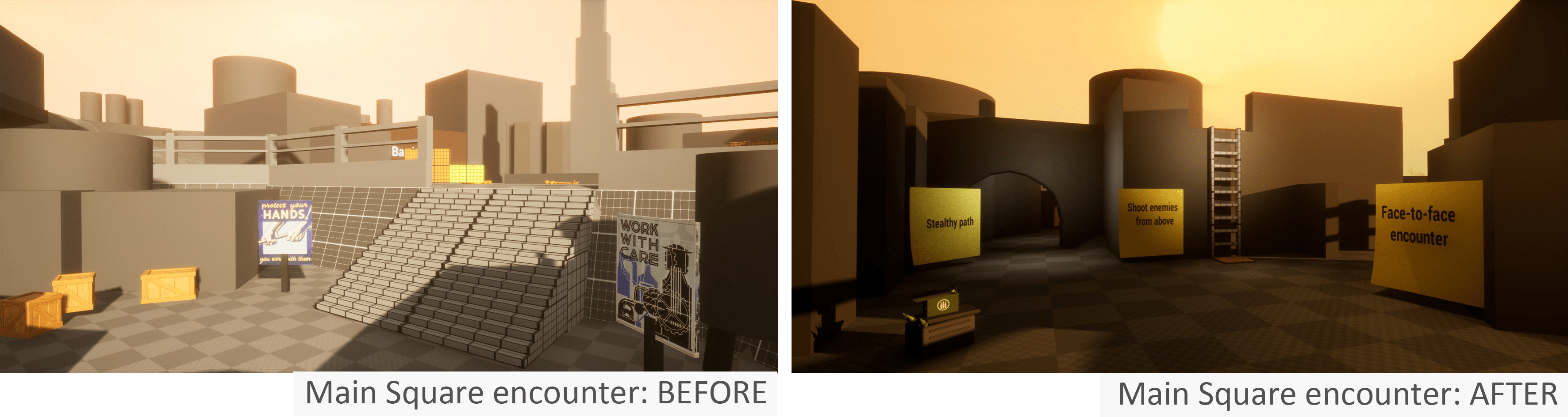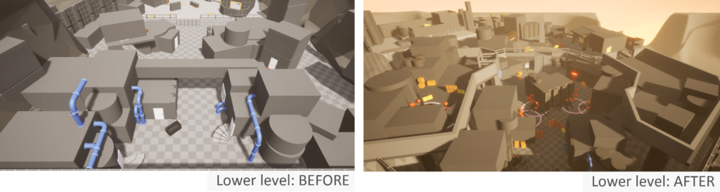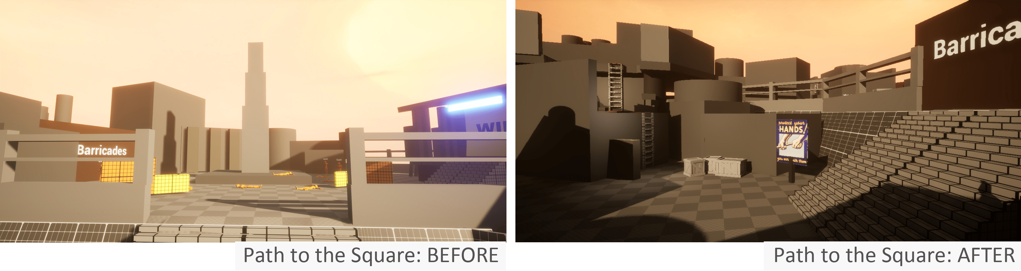 The level became more readable, grounded, and tactically interesting. The updated layout offered players more strategic options during combat, while lighting and visual cues helped guide navigation and reinforced the setting’s mood.