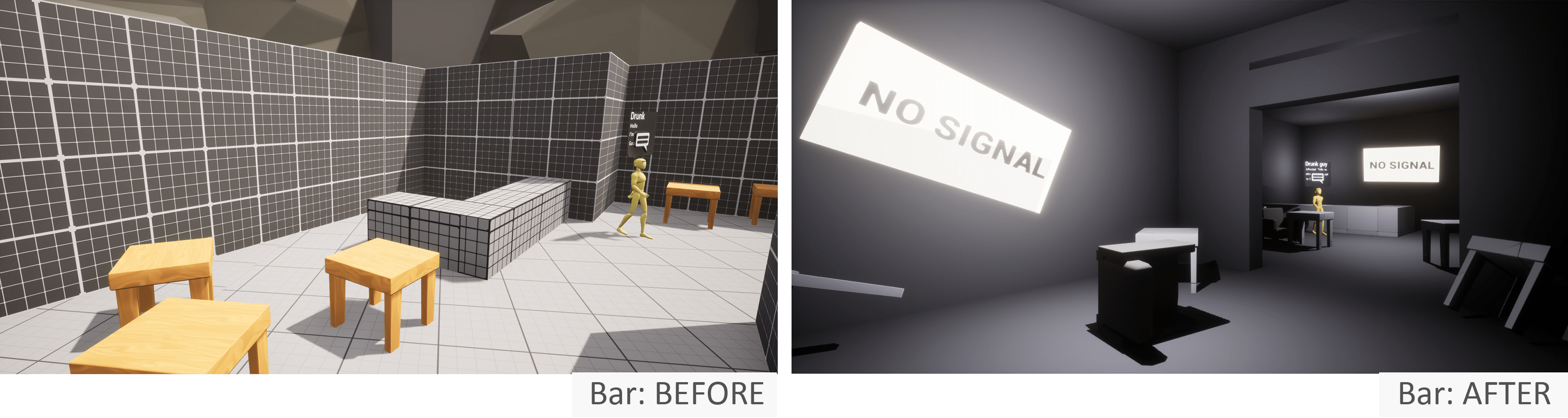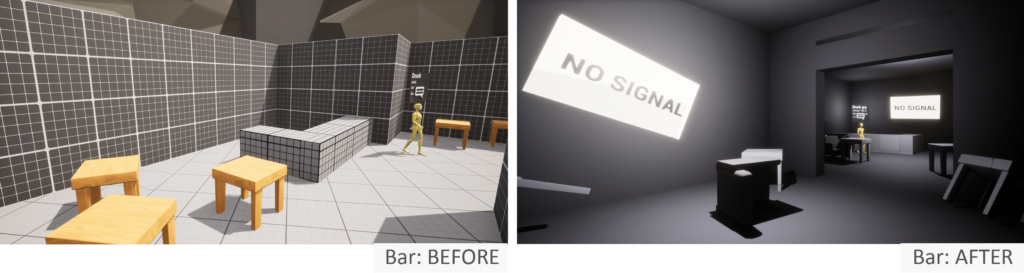- Rebuilt the Bar area with props, lighting, and Blueprints.