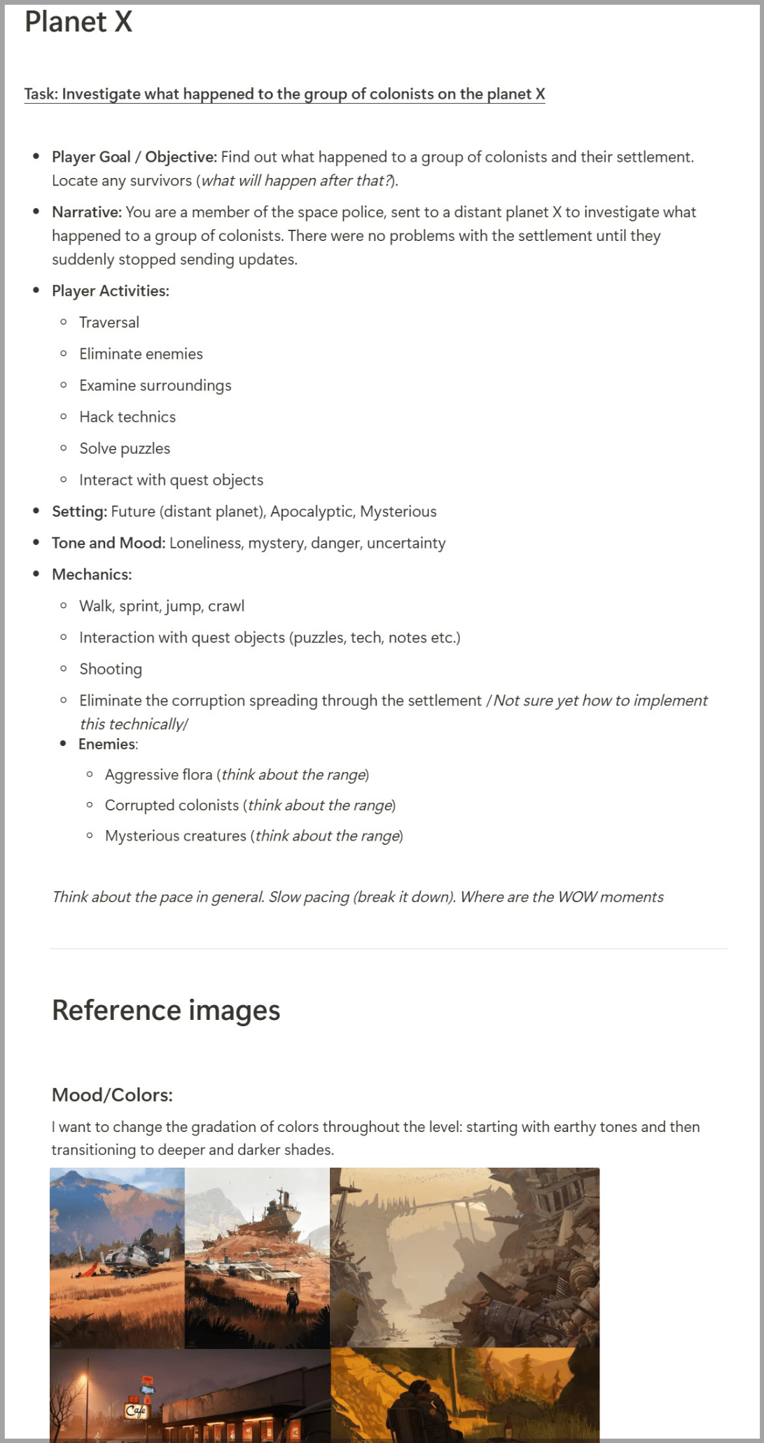 - Used a Level Design Kit for prototyping, plus created a PureRef board for visual direction.