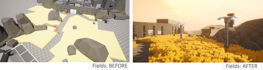 The new blockout layout brought stronger visual rhythm, clearer spatial hierarchy, and gave early combat more purpose. The colony began to feel alive, layered, and easier to navigate.