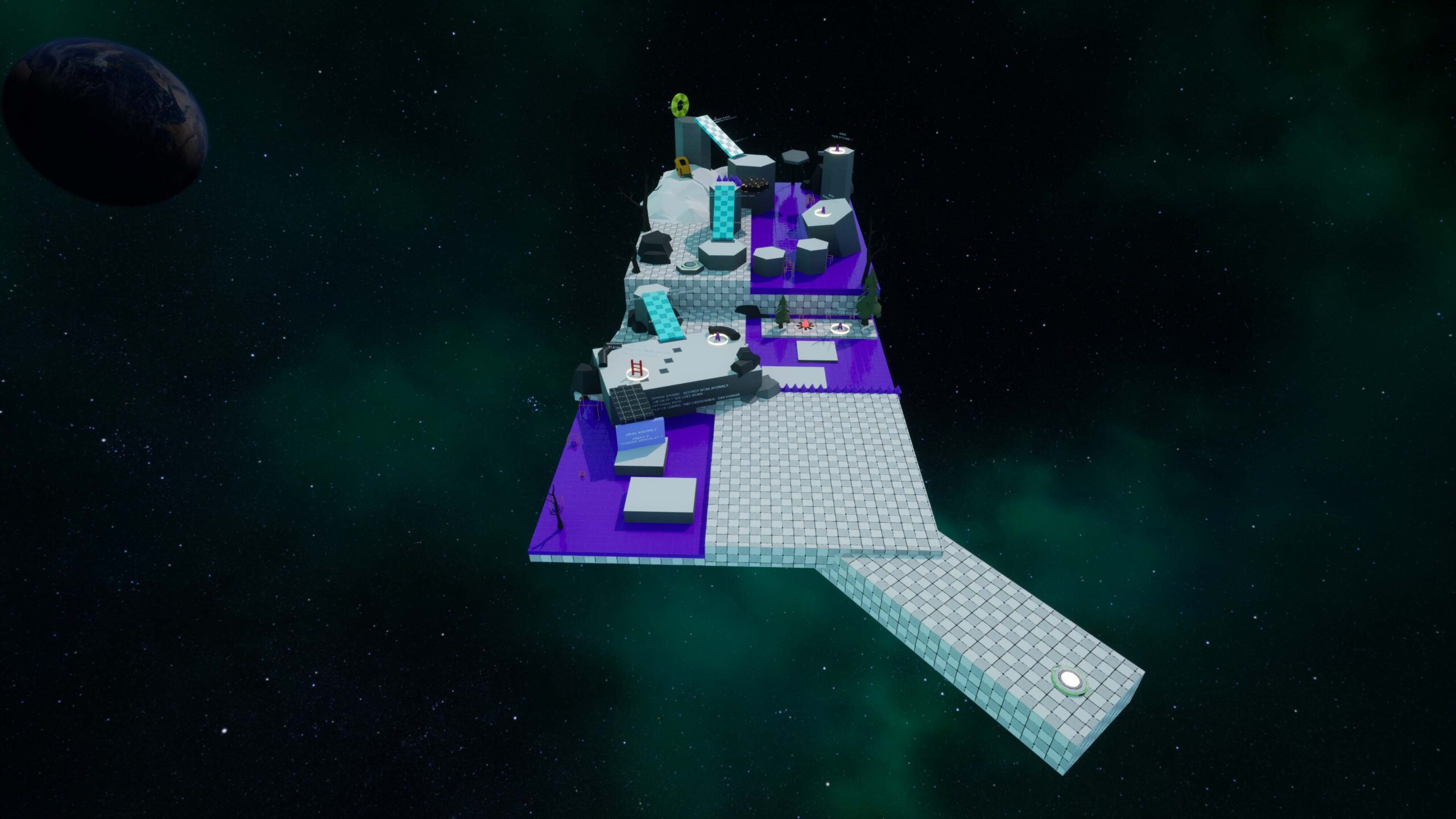 - Redesigned the spaceport: raised it to offer a panoramic view, added narrative props, and included an early jump challenge with destroyed bridges and fallen towers.