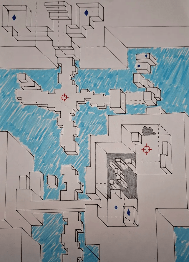 - At this stage, the upper area was optional and included a few chests. After playtesting, I decided to tie it into the golden path for stronger gameplay relevance.